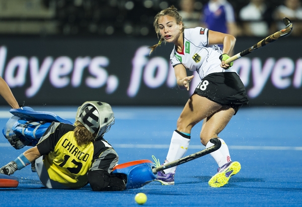 Die Folge: In der 26. Minute gab es die erste Strafecke für Deutschland. Hannah Krüger rutschte bei ihrem Schlenz-Versuch ab, der Ball kam aber noch zu Eileen Hoffmann, die aber zu überrascht war und nicht richtig zum Abschluss kam. Nach einem Foulspiel vor dem deutschen Kreis gab es die erste Strafecke für Italien. Yvonne Frank parierte allerdings stark gegen den Flachschlenzer von Constanza Aguirre (29.). Nina Hasselmann klärte danach gut gegen mehrere Gegnerinnen.