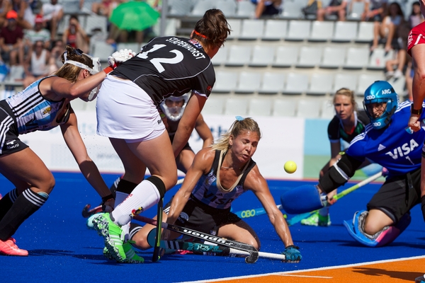 In der 5. Minute gab es die erste Strafecke für die „Las Leonas“ – trotz Videobeweises ziemlich umstritten. Doch Carla Rebecchi durfte antreten, scheiterte aber an der gut parierenden DHB-Torfrau Kristina Reynolds, die sich auch gegen die nachsetzenden Argentinierinnen behaupten konnte. Rebecchi prüfte Reynolds auch in der achten Minute mit einem freien Vorhandschuss aus sieben Metern, aber die Torhüterin war erneut auf dem Posten. Kleiner Schreck und kurze Unterbrechung in der 9. Minute, als Delfina Merino mit einer blutenden Wunde ausgewechselt wurde, nachdem sie von einer Mitspielerin mit dem Stock auf die Nase getroffen worden war.